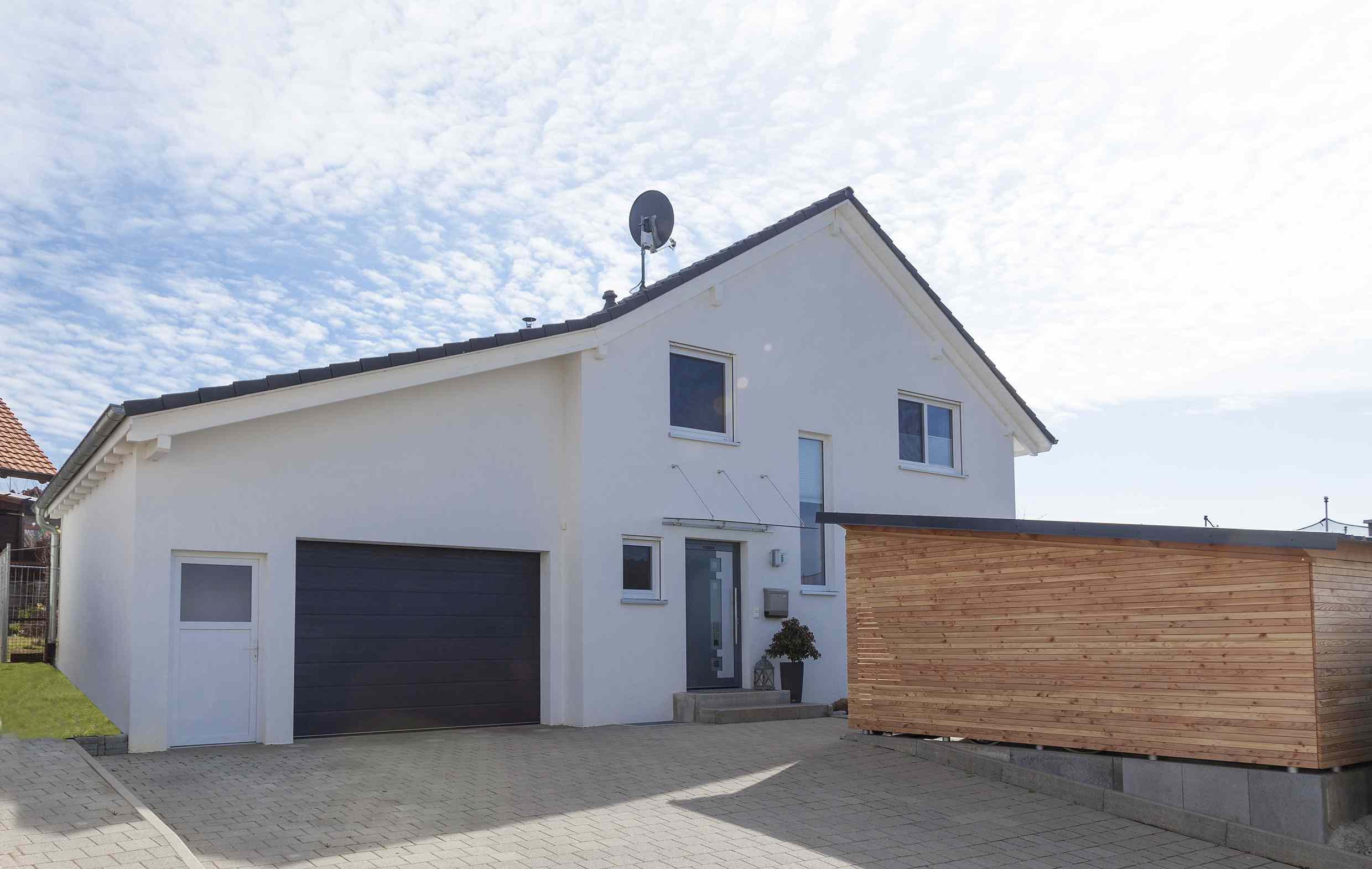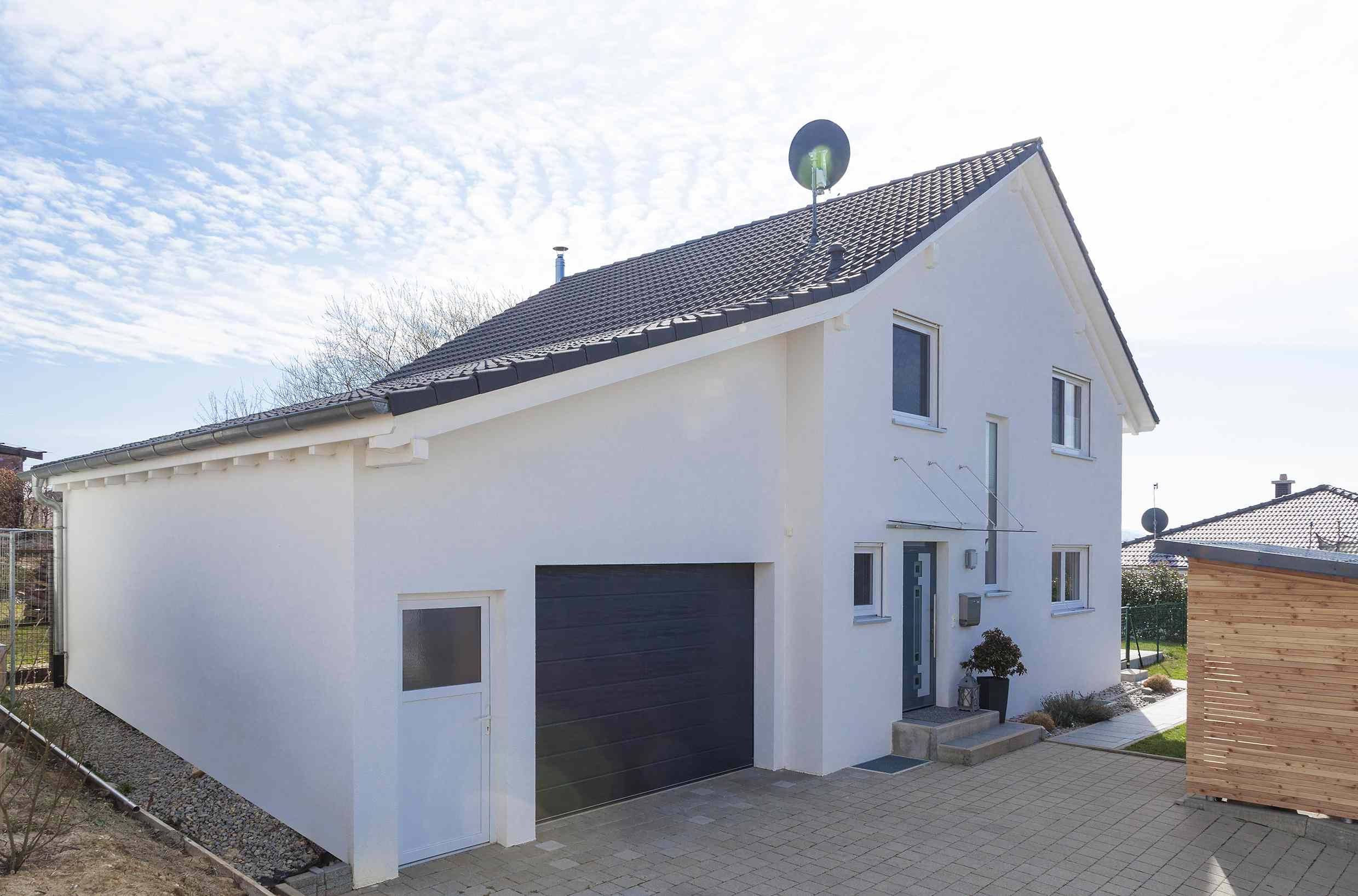 Dieses moderne Einfamilienhaus vereint klassische Formgebung mit zeitgemäßer Bauweise und kundenorientierter Planung. Ein Highlight dieses Projekts ist die großzügig dimensionierte, an das Haus angrenzende Garage, die praktisch und harmonisch integriert wurde. Die Kombination aus der klaren Linienführung und der klassischen Form des Satteldachs schafft ein Zuhause, das sowohl modern als auch traditionell wirkt.